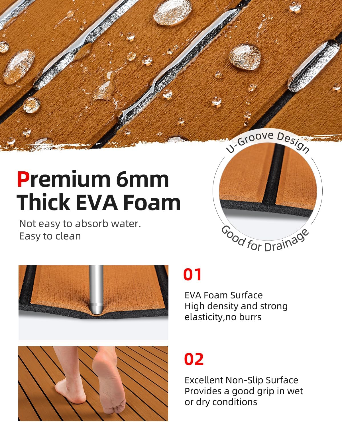 Fácil de mantener: El suelo de imitación de teca con superficie de ranura en U, que es bueno para el drenaje, proporciona una superficie antideslizante para su embarcación tanto en condiciones húmedas como secas. Esta alfombrilla de espuma EVA para barcos se puede limpiar con una escoba o una aspiradora. Si algo se derrama o se ensucia y una sola pieza está dañada, simplemente puede despegar la pieza y reemplazarla con una manta nueva.